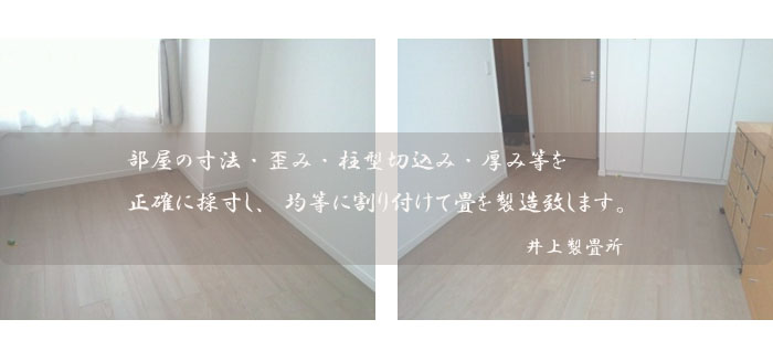 ホーム 製品紹介 サービス・料金 施工の流れ 井上製畳所について お知らせ/施工事例 お問い合わせ お知らせ/施工事例 洋室・フローリングに「畳」を敷き込む仕様 ダイケン和紙畳 新調 畳表:「銀白100A」 畳縁 : 今様 No500 (高田織物) 畳床:ダイケン畳床 厚み:30㎜ +柱型切込み 「井上製畳所」 が製作する畳は全て オーダー 品です。 <お部屋の寸法・歪み・柱型・厚み等を正確に採寸し畳を製作致します> 2024年6月29日 « 前の記事へ 次の記事へ » アーカイブ 2026年1月 (25) 2025年12月 (26) 2025年11月 (23) 2025年10月 (23) 2025年9月 (26) 2025年8月 (22) 2025年7月 (27) 2025年6月 (24) 2025年5月 (27) 2025年4月 (25) 2025年3月 (26) 2025年2月 (24) 2025年1月 (24) 2024年12月 (23) 2024年11月 (23) 2024年10月 (28) 2024年9月 (23) 2024年8月 (26) 2024年7月 (28) 2024年6月 (26) 2024年5月 (25) 2024年4月 (31) 2024年3月 (28) 2024年2月 (24) 2024年1月 (21) 2023年12月 (29) 2023年11月 (27) 2023年10月 (29) 2023年9月 (28) 2023年8月 (21) 2023年7月 (15) 2023年6月 (2) カテゴリー 「ダイケン和紙畳」(一畳サイズ縁付き) (258) 「琉球畳」(ダイケン和紙畳・半畳サイズ) (217) 「畳」施工例集 (543) ○い草 施工例集 (45) ○セキスイ美草(樹脂畳) (17) ○ふすま紙 張替 (106) ○小畳・縁雑貨 (134) ○洋室に畳・置き畳 (44) ○障子紙 張替 (54) ●お知らせ (29) ●定休日・営業時間 (9) ラインナップ (4) 畳縁 (5)