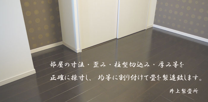 ホーム 製品紹介 サービス・料金 施工の流れ 井上製畳所について お知らせ/施工事例 お問い合わせ お知らせ/施工事例 洋室・フローリングに畳を敷き込む「黒畳空間」 「洋室・フローリングに畳を敷き込む仕様」 ダイケン和紙畳 琉球畳 畳表:「清流カラー 栗色」 畳床:ダイケン畳床 厚み: 25㎜ 新調: 11,500円 × 12帖 138,000円(税込) +柱型切込み 「井上製畳所」 が製作する畳は全て オーダー 品です。 <お部屋の寸法・歪み・柱型・厚み等を正確に採寸し畳を製作致します> 2024年9月12日 « 前の記事へ 次の記事へ » アーカイブ 2026年1月 (25) 2025年12月 (26) 2025年11月 (23) 2025年10月 (23) 2025年9月 (26) 2025年8月 (22) 2025年7月 (27) 2025年6月 (24) 2025年5月 (27) 2025年4月 (25) 2025年3月 (26) 2025年2月 (24) 2025年1月 (24) 2024年12月 (23) 2024年11月 (23) 2024年10月 (28) 2024年9月 (23) 2024年8月 (26) 2024年7月 (28) 2024年6月 (26) 2024年5月 (25) 2024年4月 (31) 2024年3月 (28) 2024年2月 (24) 2024年1月 (21) 2023年12月 (29) 2023年11月 (27) 2023年10月 (29) 2023年9月 (28) 2023年8月 (21) 2023年7月 (15) 2023年6月 (2) カテゴリー 「ダイケン和紙畳」(一畳サイズ縁付き) (258) 「琉球畳」(ダイケン和紙畳・半畳サイズ) (217) 「畳」施工例集 (543) ○い草 施工例集 (45) ○セキスイ美草(樹脂畳) (17) ○ふすま紙 張替 (106) ○小畳・縁雑貨 (134) ○洋室に畳・置き畳 (44) ○障子紙 張替 (54) ●お知らせ (29) ●定休日・営業時間 (9) ラインナップ (4) 畳縁 (5)