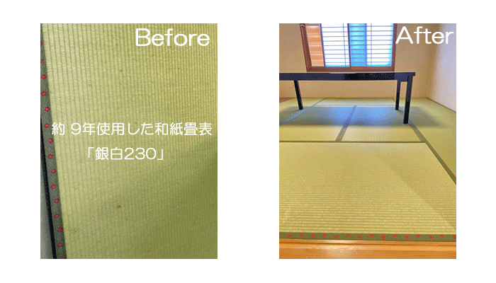ホーム 製品紹介 サービス・料金 施工の流れ 井上製畳所について お知らせ/施工事例 お問い合わせ お知らせ/施工事例 「裏返し」約9年使用した和紙畳表を裏返し 裏返し:数年使用した畳表の裏面を(裏返して)使用し張り直しすることです。 ※畳縁は新調します。 ※ダイケン和紙畳表は「表面」にキズ・シミ・汚れが有る場合でも、「裏面」はキレイな状態の場合が多いので「裏返し」の施工が可能です。 障子紙 張替(木枠洗い込) PETホームワーロン・雲竜 (PET樹脂の両面に和紙をラミネートした、衝撃に強く丈夫な障子紙) 2024年9月13日 « 前の記事へ 次の記事へ » アーカイブ 2026年1月 (25) 2025年12月 (26) 2025年11月 (23) 2025年10月 (23) 2025年9月 (26) 2025年8月 (22) 2025年7月 (27) 2025年6月 (24) 2025年5月 (27) 2025年4月 (25) 2025年3月 (26) 2025年2月 (24) 2025年1月 (24) 2024年12月 (23) 2024年11月 (23) 2024年10月 (28) 2024年9月 (23) 2024年8月 (26) 2024年7月 (28) 2024年6月 (26) 2024年5月 (25) 2024年4月 (31) 2024年3月 (28) 2024年2月 (24) 2024年1月 (21) 2023年12月 (29) 2023年11月 (27) 2023年10月 (29) 2023年9月 (28) 2023年8月 (21) 2023年7月 (15) 2023年6月 (2) カテゴリー 「ダイケン和紙畳」(一畳サイズ縁付き) (258) 「琉球畳」(ダイケン和紙畳・半畳サイズ) (217) 「畳」施工例集 (543) ○い草 施工例集 (45) ○セキスイ美草(樹脂畳) (17) ○ふすま紙 張替 (106) ○小畳・縁雑貨 (134) ○洋室に畳・置き畳 (44) ○障子紙 張替 (54) ●お知らせ (29) ●定休日・営業時間 (9) ラインナップ (4) 畳縁 (5)