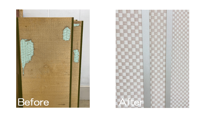 ホーム 製品紹介 サービス・料金 施工の流れ 井上製畳所について お知らせ/施工事例 お問い合わせ お知らせ/施工事例 「い草」から「市松和紙畳表」に張替+襖紙張替 ○ 畳 表替 畳表 : ダイケン和紙畳表 「銀白・市松02」 畳縁 : ストリーム・乳白色 (高田織物) 厚み : 55㎜ 七畳半間 表替 価格 : 11,0000円 × 7.5帖 82,500円 (税込) ○ 畳シート 400円/帖 ○ ふすま紙 張替 新鳥の子襖紙 「景勝 No816」 押入 + 天袋 (裏面:雲華紙) + 板戸 2024年10月16日 « 前の記事へ 次の記事へ » アーカイブ 2026年1月 (25) 2025年12月 (26) 2025年11月 (23) 2025年10月 (23) 2025年9月 (26) 2025年8月 (22) 2025年7月 (27) 2025年6月 (24) 2025年5月 (27) 2025年4月 (25) 2025年3月 (26) 2025年2月 (24) 2025年1月 (24) 2024年12月 (23) 2024年11月 (23) 2024年10月 (28) 2024年9月 (23) 2024年8月 (26) 2024年7月 (28) 2024年6月 (26) 2024年5月 (25) 2024年4月 (31) 2024年3月 (28) 2024年2月 (24) 2024年1月 (21) 2023年12月 (29) 2023年11月 (27) 2023年10月 (29) 2023年9月 (28) 2023年8月 (21) 2023年7月 (15) 2023年6月 (2) カテゴリー 「ダイケン和紙畳」(一畳サイズ縁付き) (258) 「琉球畳」(ダイケン和紙畳・半畳サイズ) (217) 「畳」施工例集 (543) ○い草 施工例集 (45) ○セキスイ美草(樹脂畳) (17) ○ふすま紙 張替 (106) ○小畳・縁雑貨 (134) ○洋室に畳・置き畳 (44) ○障子紙 張替 (54) ●お知らせ (29) ●定休日・営業時間 (9) ラインナップ (4) 畳縁 (5)