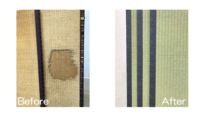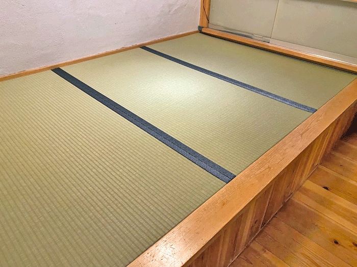 ホーム 製品紹介 サービス・料金 施工の流れ 井上製畳所について お知らせ/施工事例 お問い合わせ お知らせ/施工事例 い草から和紙畳表に張替+板戸襖の張替 施工前 ~作業風景~ ○ ダイケン和紙畳 表替 畳表 : ダイケン和紙畳表 「銀白100A」 銀白色 畳縁 : 鯔背 鮫 (高田織物) 厚み : 25㎜ 三畳間 表替 価格 : 9,000円 × 3帖 27,000円 (税込) 畳シート 400円/帖 ○ 板戸 襖 張替 織物襖紙 「はるか」No881 2025年2月1日 « 前の記事へ 次の記事へ » アーカイブ 2026年1月 (25) 2025年12月 (26) 2025年11月 (23) 2025年10月 (23) 2025年9月 (26) 2025年8月 (22) 2025年7月 (27) 2025年6月 (24) 2025年5月 (27) 2025年4月 (25) 2025年3月 (26) 2025年2月 (24) 2025年1月 (24) 2024年12月 (23) 2024年11月 (23) 2024年10月 (28) 2024年9月 (23) 2024年8月 (26) 2024年7月 (28) 2024年6月 (26) 2024年5月 (25) 2024年4月 (31) 2024年3月 (28) 2024年2月 (24) 2024年1月 (21) 2023年12月 (29) 2023年11月 (27) 2023年10月 (29) 2023年9月 (28) 2023年8月 (21) 2023年7月 (15) 2023年6月 (2) カテゴリー 「ダイケン和紙畳」(一畳サイズ縁付き) (258) 「琉球畳」(ダイケン和紙畳・半畳サイズ) (217) 「畳」施工例集 (543) ○い草 施工例集 (45) ○セキスイ美草(樹脂畳) (17) ○ふすま紙 張替 (106) ○小畳・縁雑貨 (134) ○洋室に畳・置き畳 (44) ○障子紙 張替 (54) ●お知らせ (29) ●定休日・営業時間 (9) ラインナップ (4) 畳縁 (5)