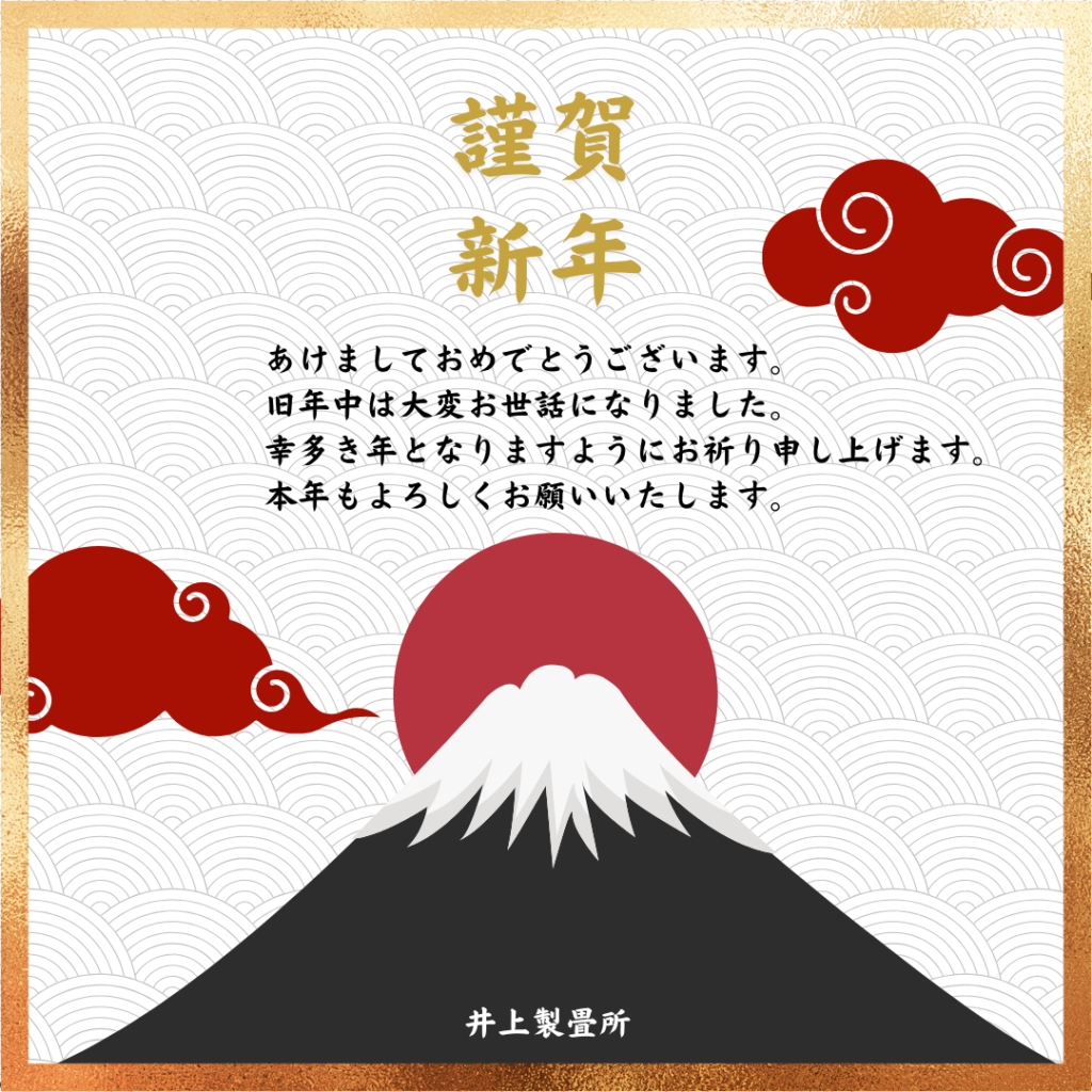 ホーム 製品紹介 サービス・料金 施工の流れ 井上製畳所について お知らせ/施工事例 お問い合わせ お知らせ/施工事例 [2026年] あけましておめでとうございます. 2026年1月1日 « 前の記事へ 次の記事へ » アーカイブ 2026年1月 (11) 2025年12月 (26) 2025年11月 (23) 2025年10月 (23) 2025年9月 (26) 2025年8月 (22) 2025年7月 (27) 2025年6月 (24) 2025年5月 (27) 2025年4月 (25) 2025年3月 (26) 2025年2月 (24) 2025年1月 (24) 2024年12月 (23) 2024年11月 (23) 2024年10月 (28) 2024年9月 (23) 2024年8月 (26) 2024年7月 (28) 2024年6月 (26) 2024年5月 (25) 2024年4月 (31) 2024年3月 (28) 2024年2月 (24) 2024年1月 (21) 2023年12月 (29) 2023年11月 (27) 2023年10月 (29) 2023年9月 (28) 2023年8月 (21) 2023年7月 (15) 2023年6月 (2) カテゴリー 「ダイケン和紙畳」(一畳サイズ縁付き) (257) 「琉球畳」(ダイケン和紙畳・半畳サイズ) (215) 「畳」施工例集 (536) ○い草 施工例集 (44) ○セキスイ美草(樹脂畳) (14) ○ふすま紙 張替 (104) ○小畳・縁雑貨 (132) ○洋室に畳・置き畳 (44) ○障子紙 張替 (53) ●お知らせ (28) ●定休日・営業時間 (9) ラインナップ (4) 畳縁 (5)