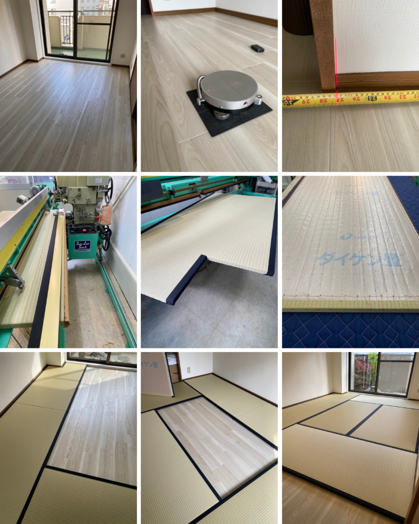 ホーム 製品紹介 サービス・料金 施工の流れ 井上製畳所について お知らせ/施工事例 お問い合わせ お知らせ/施工事例 洋室に「オーダー畳」ピッタリ敷き込み施工 洋室の形に合わせてピッタリ収める、ズレない、動かない畳空間 ダイケン和紙畳 新調 畳表:「銀白100A 若草色」 畳縁 : 御座縁 黒(高田織物) 畳床:ダイケンⅠ型畳床 厚み:30㎜ 価格:15,500円 × 6帖 93,000円 変形・柱型切り込み 1,000円 「井上製畳所」 が製作する畳は全て オーダー 品です。 <お部屋の寸法・歪み・柱型・厚み等を正確に採寸し畳を製作致します> 2026年1月15日 « 前の記事へ 次の記事へ » アーカイブ 2026年1月 (11) 2025年12月 (26) 2025年11月 (23) 2025年10月 (23) 2025年9月 (26) 2025年8月 (22) 2025年7月 (27) 2025年6月 (24) 2025年5月 (27) 2025年4月 (25) 2025年3月 (26) 2025年2月 (24) 2025年1月 (24) 2024年12月 (23) 2024年11月 (23) 2024年10月 (28) 2024年9月 (23) 2024年8月 (26) 2024年7月 (28) 2024年6月 (26) 2024年5月 (25) 2024年4月 (31) 2024年3月 (28) 2024年2月 (24) 2024年1月 (21) 2023年12月 (29) 2023年11月 (27) 2023年10月 (29) 2023年9月 (28) 2023年8月 (21) 2023年7月 (15) 2023年6月 (2) カテゴリー 「ダイケン和紙畳」(一畳サイズ縁付き) (257) 「琉球畳」(ダイケン和紙畳・半畳サイズ) (215) 「畳」施工例集 (536) ○い草 施工例集 (44) ○セキスイ美草(樹脂畳) (14) ○ふすま紙 張替 (104) ○小畳・縁雑貨 (132) ○洋室に畳・置き畳 (44) ○障子紙 張替 (53) ●お知らせ (28) ●定休日・営業時間 (9) ラインナップ (4) 畳縁 (5)